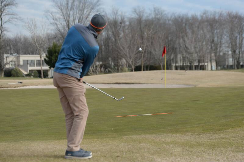 Coloque la varilla perpendicular a la linea de sus pies y 1 metro delante e inclinada. Haga sus chips buscando que las manos peguen adelante y evitar pegarle a la varilla con la vara de su wedge.
