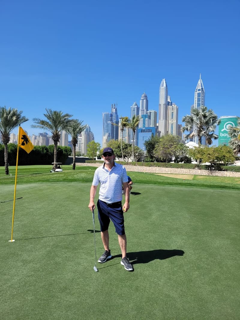 "El día de práctica nos sirvió mucho para reconocer la hermosa cancha Dubai Creek. El hecho de estar en medio de la ciudad y las vistas que tiene es alucinante, se te van los ojos para todos lados. Uno de los hoyos que más me gustó fue el 17, un par 4 muy finito con búnker a la derecha, palmeras y a la izquierda agua. Salí con una madera 3 y por suerte la dejé en el fairway y terminé con bogey", comentó Vázquez, uno de los ganadores del viaje que entregó El Cronista Open Golf en 2022.