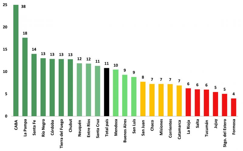 El promedio nacional se ubica en 11 MiPyMEs cada mil habitantes, y hay un sexteto de jurisdicciones muy próximas a la media nacional: Neuquén (12), Entre Ríos (12), Santa Cruz (11), Mendoza (10), Buenos Aires y San Luis (9).