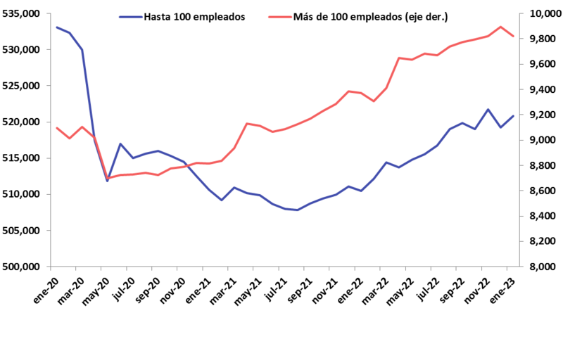 La situación difiere notablemente para las empresas de mayor envergadura, que tuvieron una merma mucho menor en pandemia, y están plenamente recuperadas. Por supuesto, no alcanza para compensar la situación de las MiPyMEs, ya que el número de empresas grandes creció apenas en 700 en 3 años.