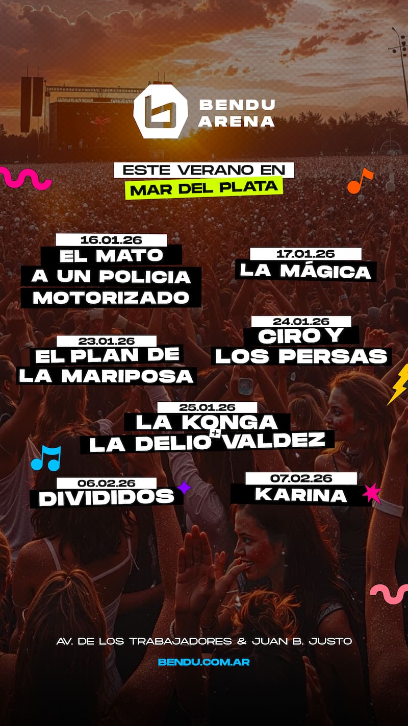 Este verano marca un antes y un después en la escena musical de la costa argentina: Bendu Arena, el nuevo venue premium de Mar del Plata, abre su temporada con el mejor line-up del verano, encabezado por El Mató a un Policía Motorizado, La Mágica, El Plan de la Mariposa, Ciro y Los Persas, La K’onga, La Delio Valdez, Divididos y Karina - La Princesita, entre otros artistas que se anunciarán durante enero y febrero.