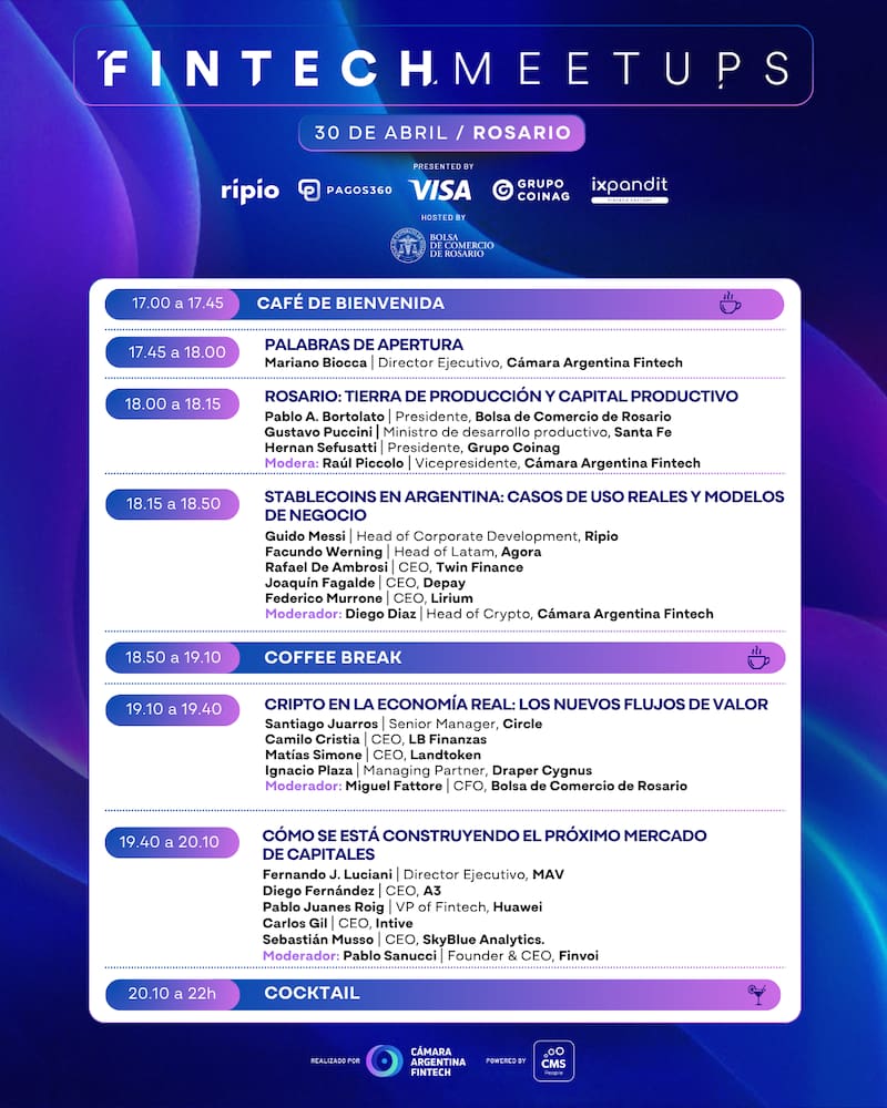La Cámara Argentina Fintech continúa el calendario 2026 de sus Fintech Meetups con una nueva edición en Rosario. Se realizará el próximo 30 de abril, con la Bolsa de Comercio de Rosario como host y será la segunda parada del año de este ciclo federal que recorre distintas ciudades del país promoviendo el diálogo entre los principales actores del sistema financiero.