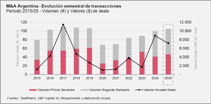 El informe detalla además que por primera vez desde 2020, los compradores locales fueron mayoría, representando el 57% de los deals, frente a los extranjeros que habían sido más activos en años anteriores. Este cambio refleja el protagonismo de inversores locales en la primera etapa del nuevo modelo económico. Los valores de las transacciones también crecieron, ya que hubo 6 deals con tickets por arriba de US$500 millones, el registro más alto en al menos 15 años, y 13 operaciones por encima de US$100 millones. Gradualmente están volviendo a Argentina las transacciones estratégicas de valor.
