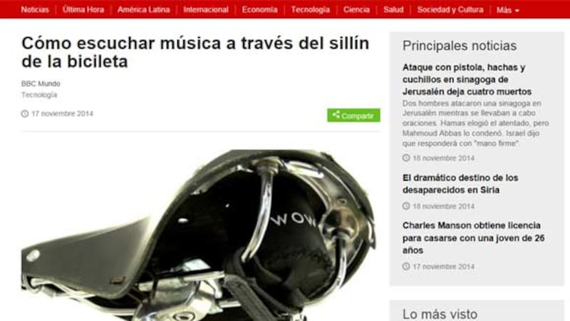 Olvídense de los cables y de los auriculares para escuchar música mientras anda en bicicleta. Ahora podrá hacerlo a través del asiento de la bici gracias a un dispositivo que convierte “señales eléctricas en pulsaciones que se propagan por el asiento, que está en contacto con los glúteos del ciclista”.