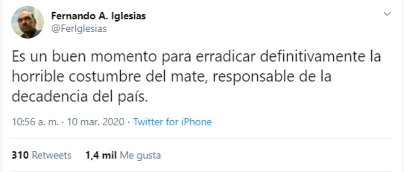 El Diputado nacional de Cambiemos, Fernando Iglesias, manifestó a través de su cuenta de Twitter su desprecio por el mate. Esta crítica surgió a raíz de la recomendación de la Corte Suprema de no compartir la bebida emblema de los argentinos en espacios laborales. Además la Sociedad de Infectología sugirió el "lavado de manos frecuente".