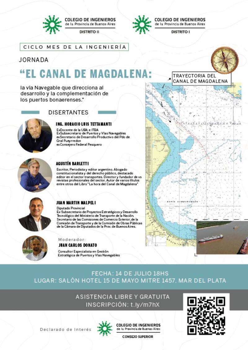 Organizado por el Colegio de Ingenieros de la Provincia de Buenos Aires, (Distritos I y II), el 14 de julio a partir de las 18 hs se llevará a cabo la Jornada "El Canal Magdalena, la Vía Navegable que Direcciona al Desarrollo y la Complementación de los Puertos Bonaerenses".