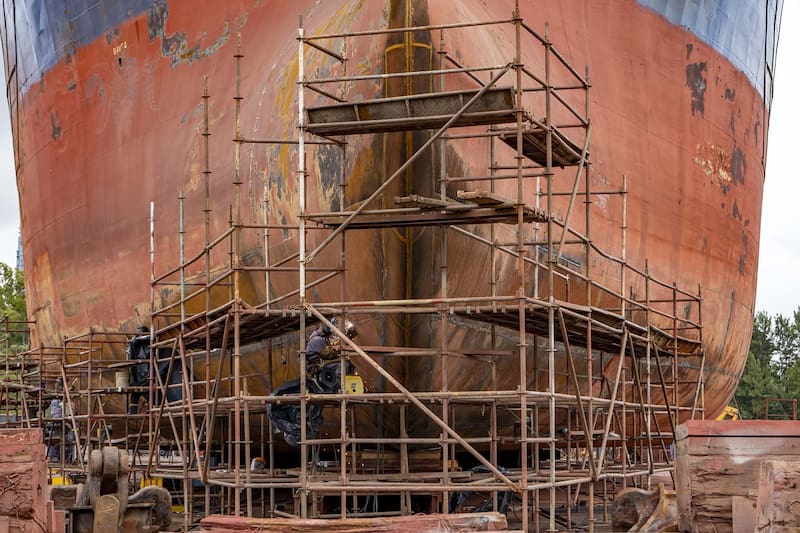 Los trabajos de calderería incluirán repasos y refuerzos de soldaduras, renovación de chapas en tanques de lastre, reposición de plataformas y escalones, intervención en bocas de lobo de proa y popa, fabricación de nuevas rejillas de ventilación y adecuación de basamentos y soportes en distintos sectores de la cubierta.
