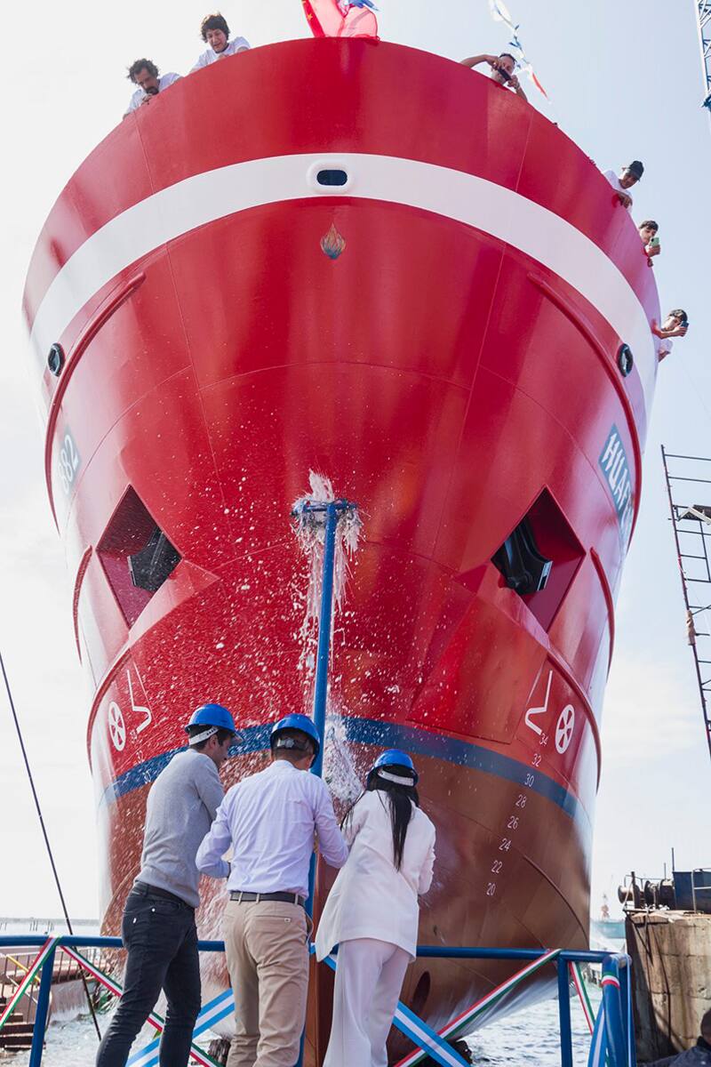 El "Huafeng 882" recibió su bautismo por parte del Obispo Gabriel Mestre y la madrina de la ceremonia, María Cecilia Giacur fue la encargada de estrellar la botella de champagne contra el casco del buque en el instante previo a que tocara por primera vez las aguas del mar. La transmisión integral realizada en vivo a través de las redes sociales del astillero permitió difundir en tiempo real este evento o bien revivir la emocionante ceremonia.