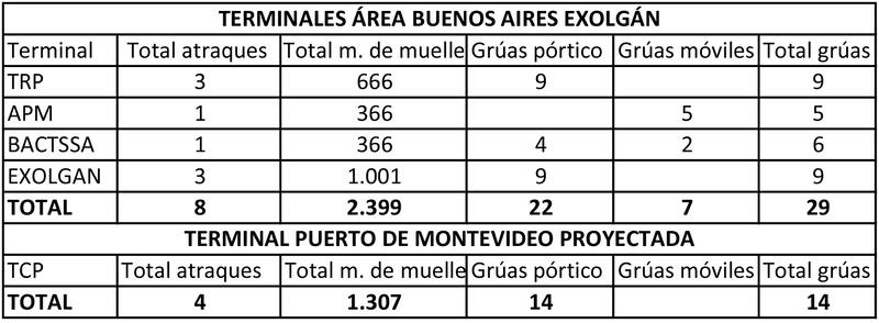 Entre las terminales de Puerto Buenos Aires y Exolgan, suman ocho sitios de atraque de entre 300 y 366 metros de extensión cada uno lo que hacen un total de casi 2.400 metros de muelle. Cuesta creer que Montevideo, que según su plan de expansión proyecta cuatro sitios de entre 240 metros y 366 metros de largo que hacen 1.307 metros de muelle, pueda duplicar a Buenos Aires.