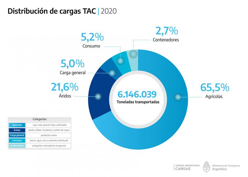 Trenes Argentinos Cargas (TAC), organismo dependiente del Ministerio de Transporte, encargado de la gestión de las tres líneas estatales de cargas -Belgrano, San Martín y Urquiza-, cerró el 2020 con un total de 6.146.039 toneladas frente a las 5.347.411 contabilizadas el año anterior, número que significó el mejor registro de TAC en los últimos 10 años, que se encuadra dentro del plan estratégico que impulsa medidas para potenciar todas las modalidades de transporte y beneficiar las economías regionales de todo el país.
