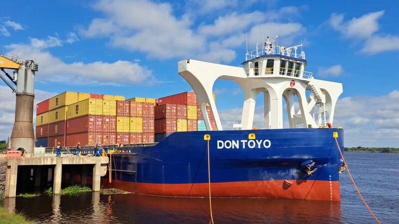 Fiesta en el Astillero Aguapé. El buque portacontenedores DonToyo, propiedad de la naviera Transporte Fluvial Paraguayo (TFP) del Grupo Toyotoshi S.A. inició su viaje inaugural.