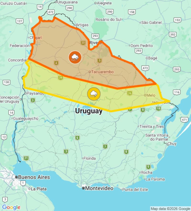 Además de la advertencia naranja, Inumet mantiene un aviso amarillo para tormentas puntualmente fuertes y lluvias abundantes en otras localidades de Cerro Largo, Durazno, Paysandú, Salto y Tacuarembó. El boletín detalla cada una de las zonas bajo esta segunda categoría, que supone menor severidad pero recomienda atención y precaución.
