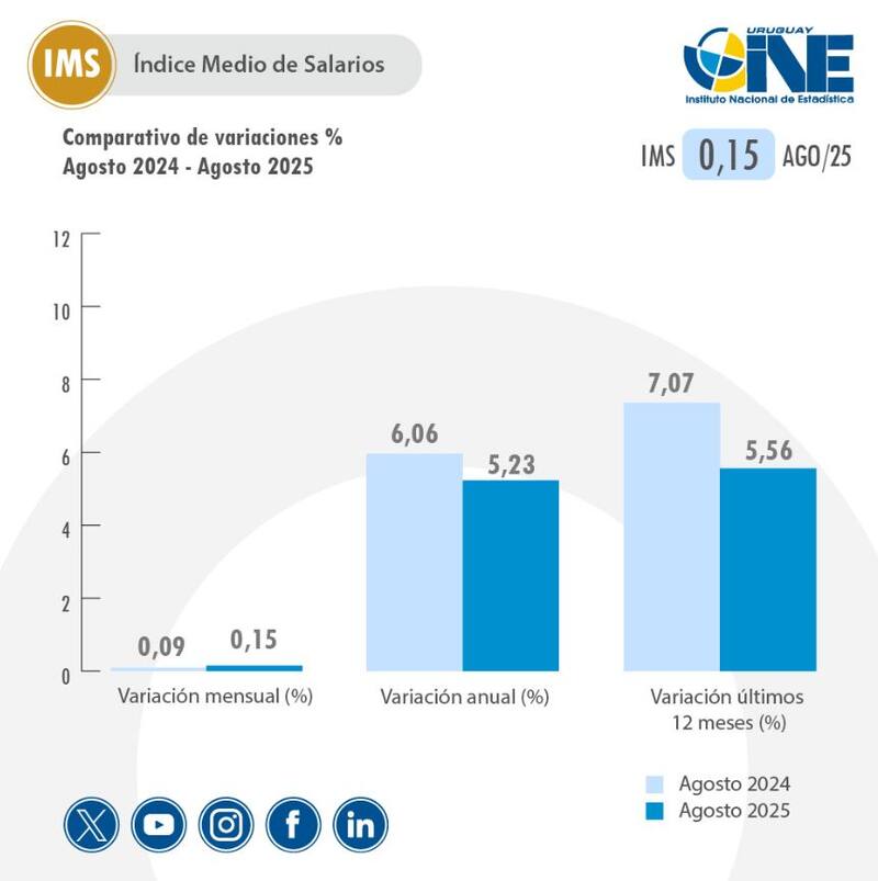 El informe oficial también destaca que el Índice Medio de Salarios Nominales (IMSN) -que es utilizado para ajustar pasividades- mostró una variación del 5,51% en los últimos 12 meses, con un avance mensual del 0,18%.
