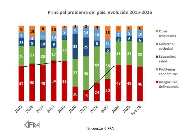 El dato muestra cierta estabilidad con años precedentes, ya que en 2024 y 2025 los temas de seguridad pública eran el principal problema para el 48%.