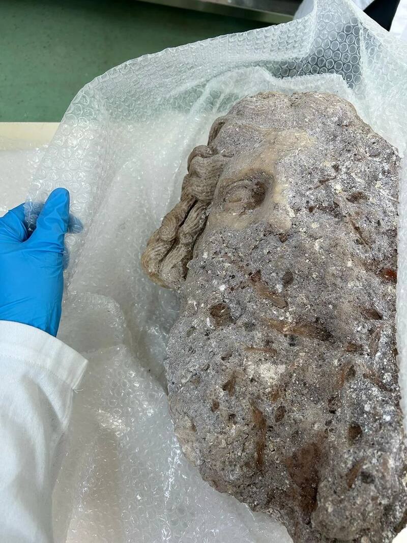 Se trata de una cabeza de mármol tallada con gran detalle. Estaba oculta en los cimientos de la iglesia, parcialmente cubierta por una gruesa capa de mortero. Aun así, los rizos del cabello y la barba emergieron con una gran definición.