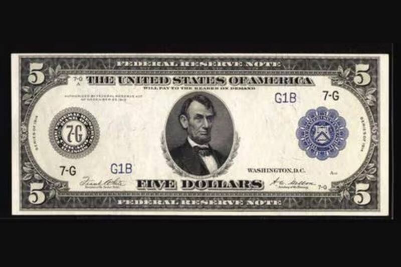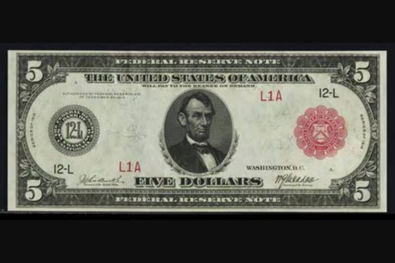Billete de u$s 5 de la reserva federal con sello rojo del año 1914