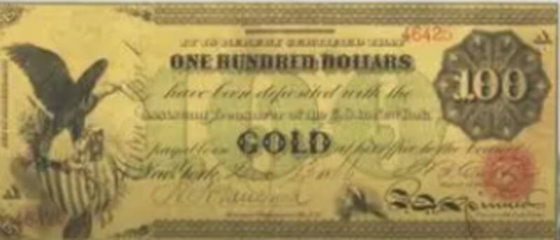 Aquel valioso billete que se vende por u$s2 millones tiene un valor monetario de u$s100 y fue emitido en 1863. Está impreso con tinta negra en papel teñido de oro y el reverso cuenta con la frase "Cien dólares en moneda de oro".