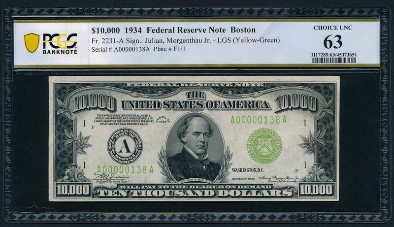 El billete de 10.000 dólares, que sigue siendo legal aunque es raro. Este billete lleva la imagen de Salmon P. Chase, secretario del Tesoro durante la Guerra Civil, en lugar de un presidente.