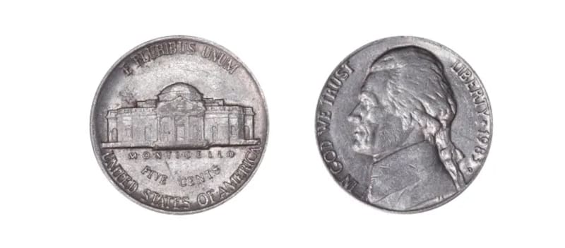 La moneda de 5 centavos que se suele llamar ‘nickel' se creó en 1866 y desde 1938 tiene al presidente Thomas Jefferson en el anverso de la misma. Sus iniciales aparecen en la base del busto y lo acompañan las palabras "IN GOD WE TRUST", "LIBERTY" y "1983".