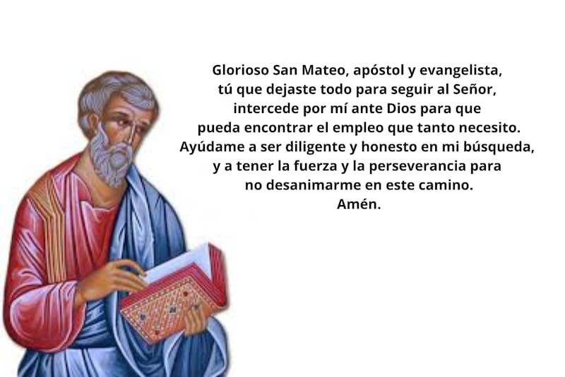 Glorioso San Mateo, apóstol y evangelista, tú que dejaste todo para seguir al Señor, intercede por mí ante Dios para que pueda encontrar el empleo que tanto necesito.