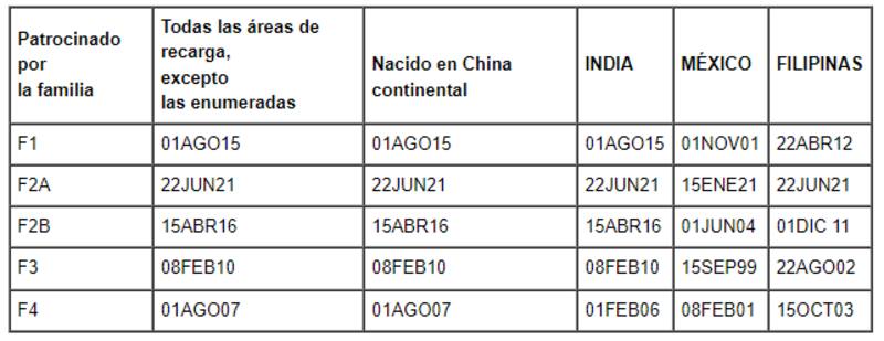 Las preferencias patrocinadas por la familia, según Oficina de Asuntos Consulares del Departamento de Estado, son:
