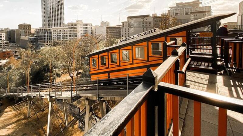 El ferrocarril Angels Flight conecta las calles Hill Street y Olive Street, y está a tan solo dos cuadras de Pershing Square.