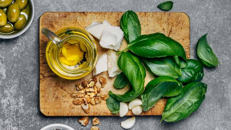 El pesto, elaborado con albahaca, piñones, aceite de oliva, queso parmesano y ajo, es una de las salsas más populares para acompañar la pasta fresca.