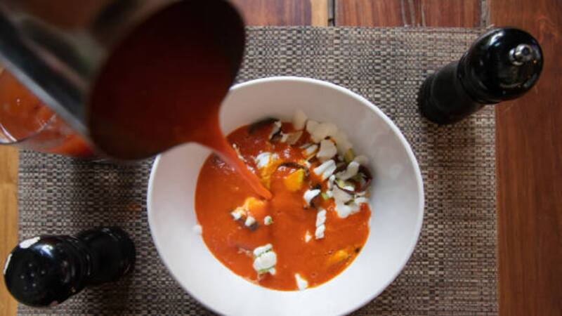 Agregar el caldo: añade el caldo de pollo a la mezcla de tomate, lleva a ebullición y luego cocina a fuego lento por 15 minutos.