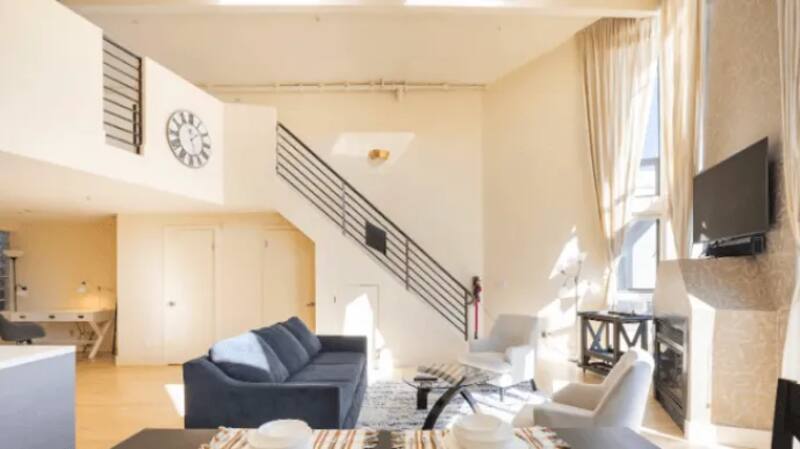 El departamento de doble planta se encuentra en el último piso del edificio en el barrio de South of Market. Se encuentra cerca del centro de la ciudad en auto y el vecindario se destaca por el diseño exterior de las propiedades, lo que lo convierte en un lugar hogareño para instalarse.