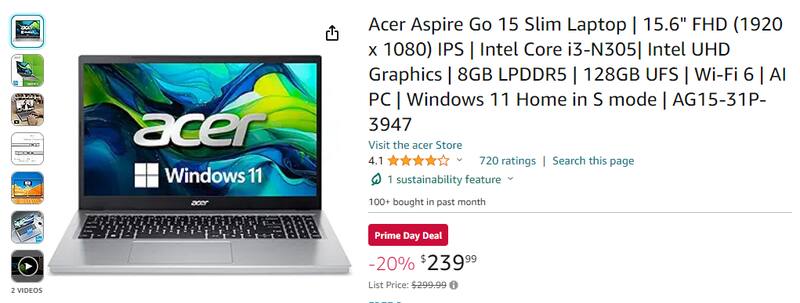 Una de las ofertas abarca a la portátil Acer Aspire Go 15 Slim con las siguientes características: 15,6" FHD (1920 x 1080) IPS, Intel Core i3-N305, Gráficos Intel UHD, Wi-Fi 6, PC con IA (Inteligencia Artificial) y Windows 11 Home en modo S.