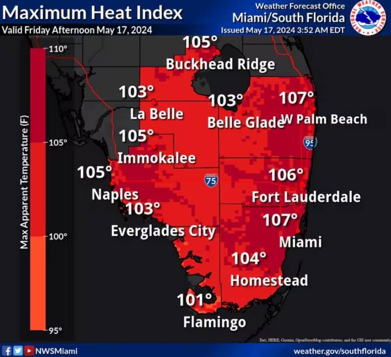 La advertencia para Miami-Dade estará vigente hasta las 20:00 EDT del viernes, y para Monroe hasta las 18:00 EDT, aunque se prevé que las temperaturas extremas continuarán durante el fin de semana. El sábado, el índice de calor no bajará de los 41 grados en Miami-Dade y podría alcanzar los 43 grados en Shark Valley.