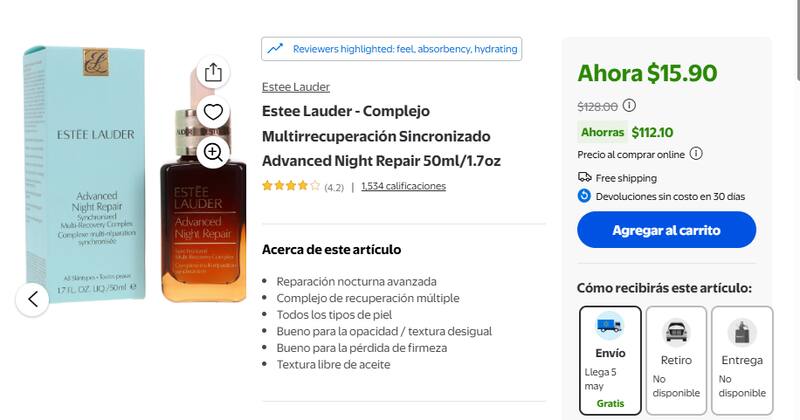 Hoy en Walmart, este sérum anti age de lujo cuesta USD 15.90, cuando su valor original es de USD 128.00, lo que significa que ahorras USD 112.10. Además, si compras online, accedes al envío gratis enEstados Unidos y devoluciones sin costo en 30 días.