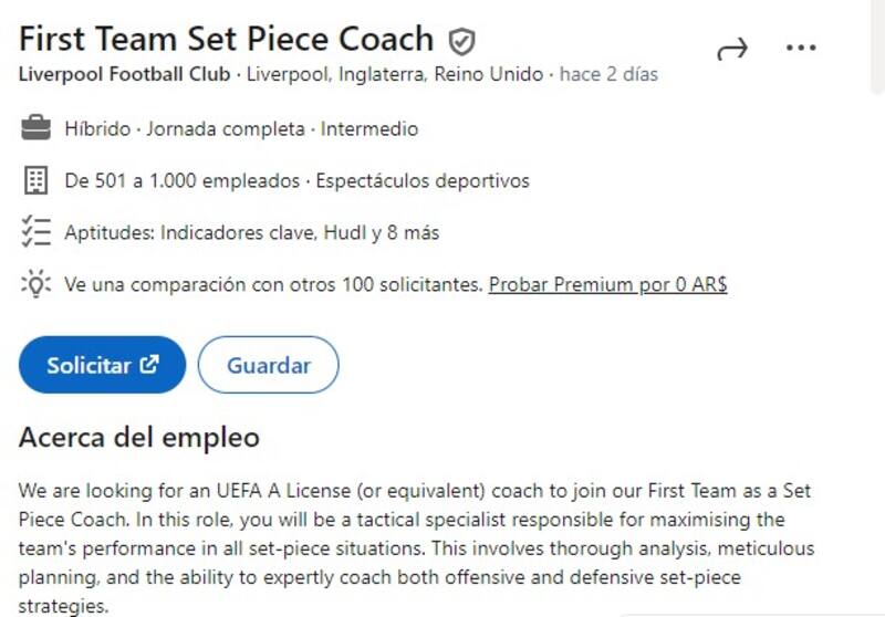 La vacante para el puesto de entrenador de jugadas a balón parado se anunció en LinkedIn, permitiendo que cualquier persona interesada pueda postularse.