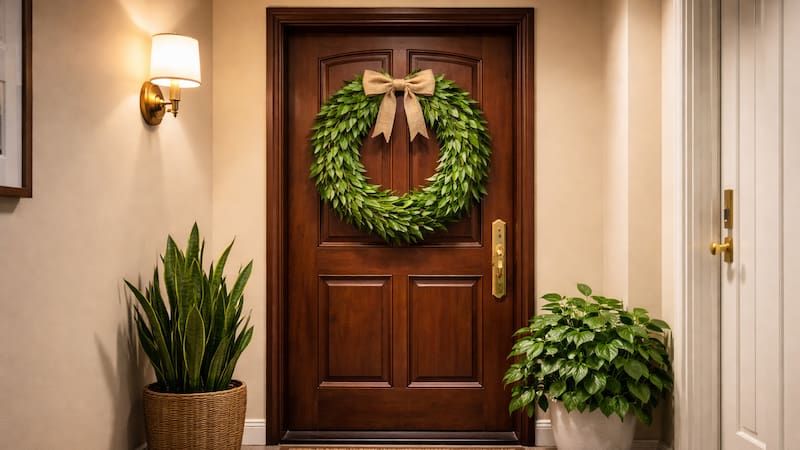 Además de su carga simbólica, el laurel seco aporta un detalle decorativo minimalista. Su tono verde oscuro —a veces con matices dorados— encaja bien en puertas de madera o hierro y transmite una sensación de hogar cálido y cuidado.