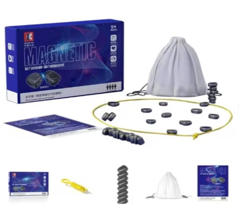 Incluye aproximadamente 20 imanes negros sueltos, un carrete de soga amarilla, una bolsa plástica para almacenamiento y un folleto de instrucciones de juego.