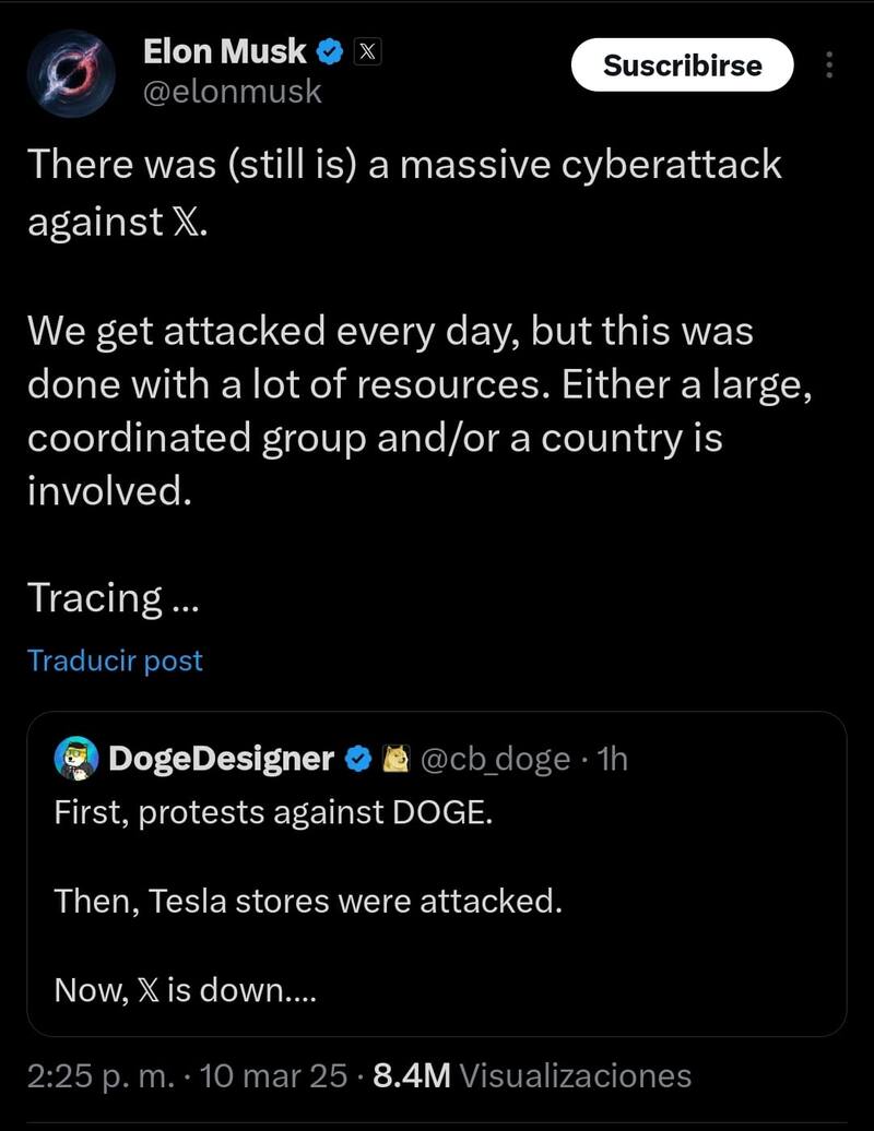 Musk respondía a una publicación que hablaba de "protestas contra el DOGE" (Departamento de Eficiencia Gubernamental del Gobierno de Donald Trump), ataques a tiendas de Tesla (su empresa de vehículos eléctricos) y aventuraba que las caídas de X eran fruto de un "ataque".