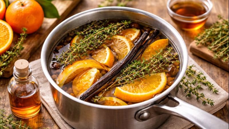Hervir tomillo, cáscara de mandarina y esencia de vainilla es una forma simple y natural de perfumar el hogar sin recurrir a aerosoles ni productos químicos. Esta combinación se utiliza en los llamados simmer pots, una técnica que aprovecha el vapor para liberar aromas cálidos y agradables de manera progresiva.