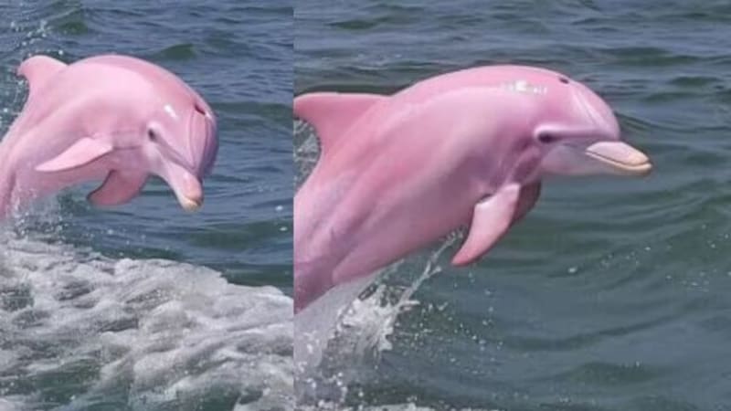 Las imágenes, que se compartieron por primera vez en Facebook, muestran un delfín de color rosa saltando en el aire en Hatteras Beach. Según la publicación, el delfín había salido de su hábitat natural y fue encontrado abandonado en la orilla.