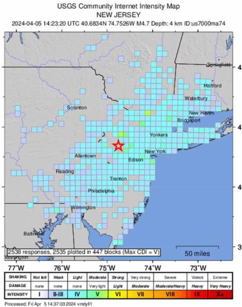El USGS registró este nuevo movimiento telúrico como de magnitud 4.0, percibido a las 5:59 p.m. a 7 kilómetros al suroeste de Gladstone, Nueva Jersey. Se ubicó en la longitud 40.685°N y latitud 74.735°W, con una profundidad de 9.4 kilómetros.