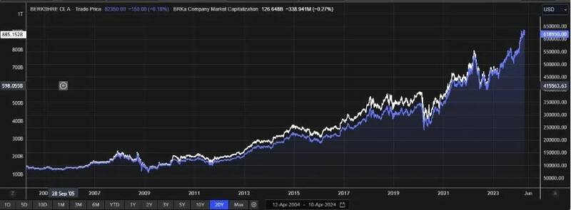 Con una capitalización actual de 885.000 millones de dólares, Berkshire Hathaway ha demostrado un crecimiento constante a lo largo de los años.